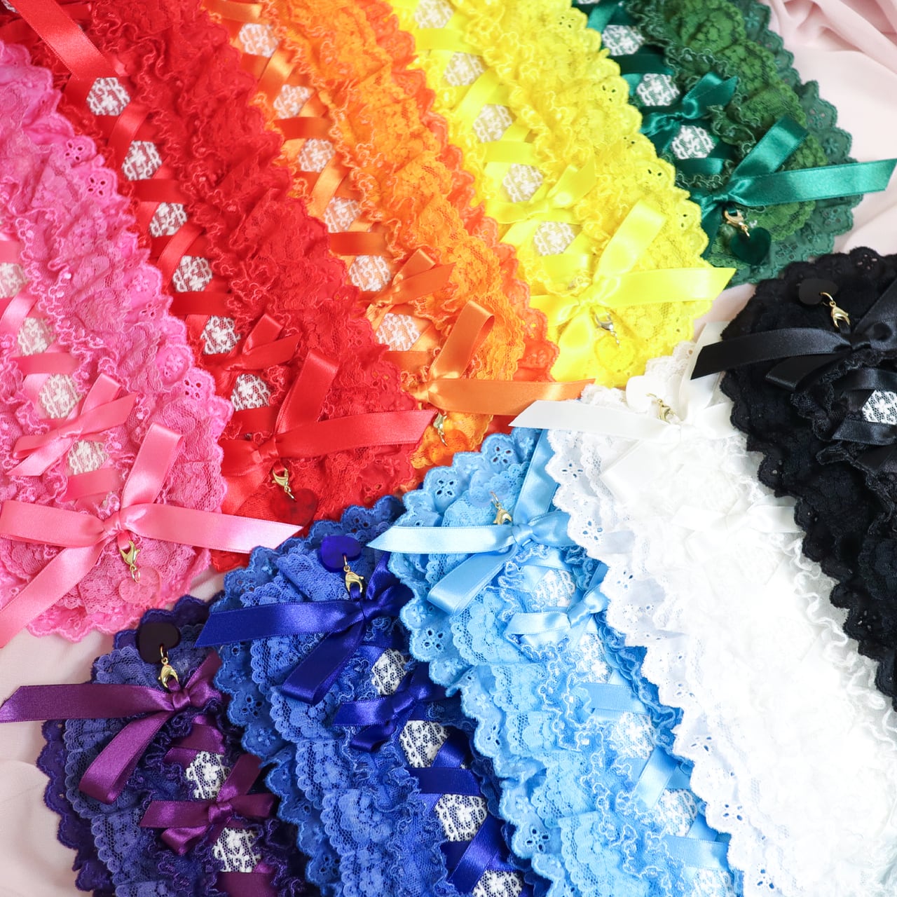 すべて手作業での作製につき個体差があります。レースは染料を用いて染色しておりますので個体差や若干の色むらなどがございます。